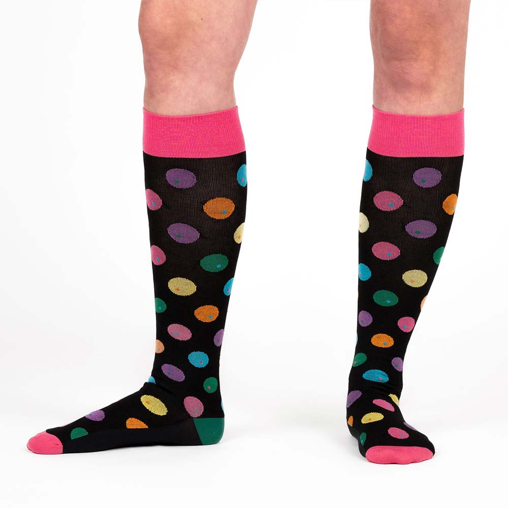 Die bunten Stützstrümpfe aus Baumwolle sind in Kooperation mit den CliniClowns entstanden, die in in Spitälern und Pflegeeinrichtungen bei schwerkranken Kindern und Erwachsenen für Lachen und damit Ablenkung sorgen. Darum stehen die großen Punkte auf unserem Charity-Stützstrumpf für die vielen bunten Clownnasen.