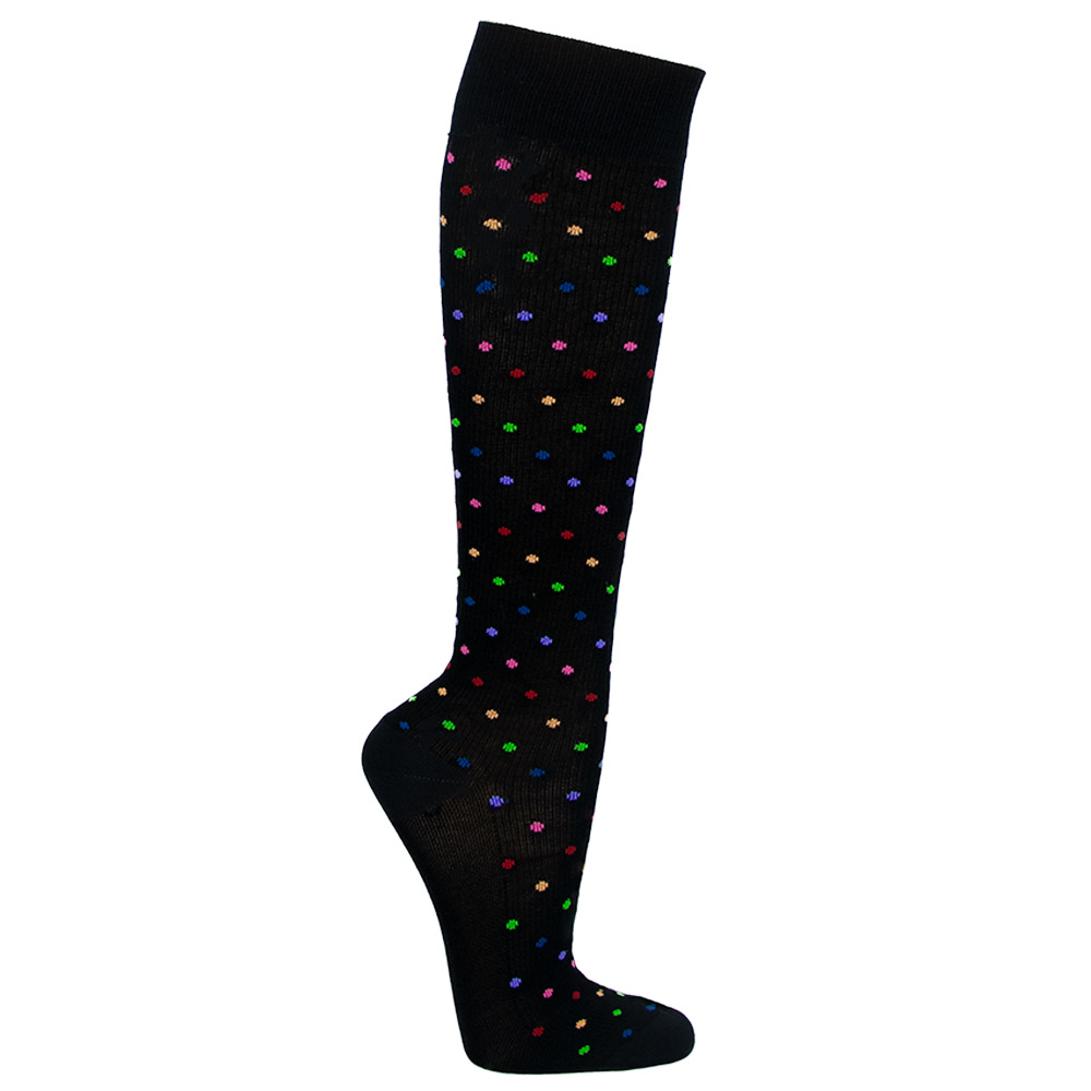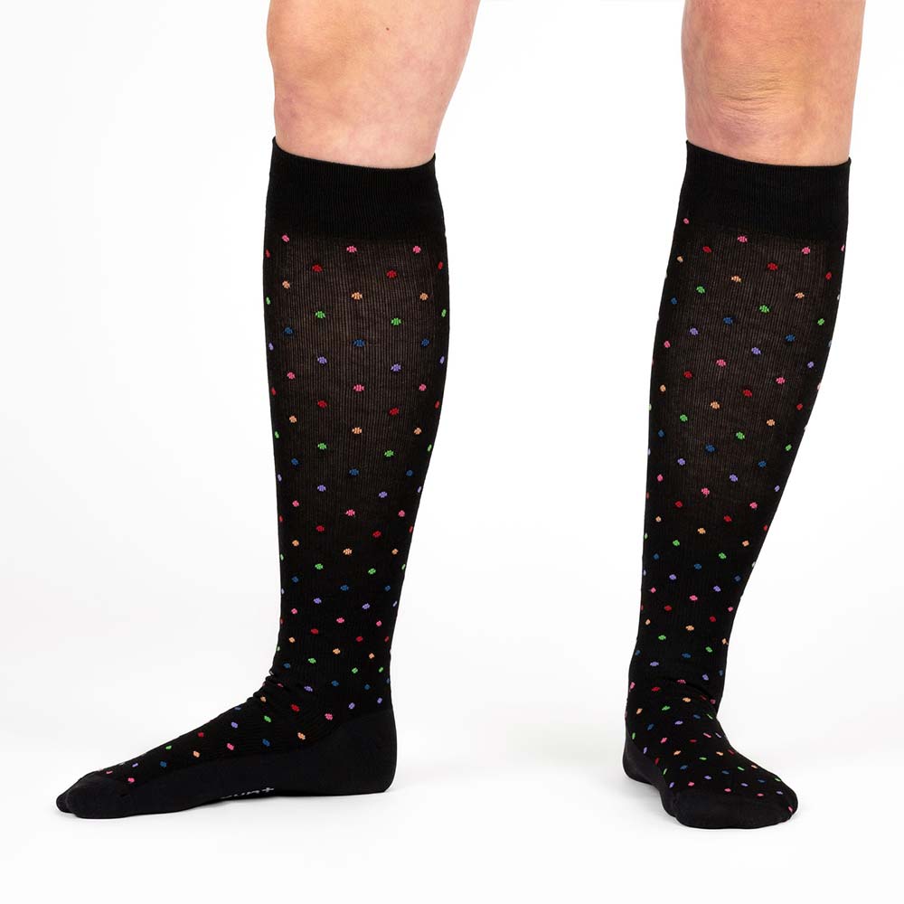 Carmen ist ein echtes Allround-Talent für jeden Anlass: Der schwarze Stützstrumpf für Damen und Herren wirkt auf den ersten Blick unauffällig. Beim genaueren Hinsehen entfachen die vielen Pünktchen in den xunt-Farben aber einen bunten Konfettiregen am Bein. Die schwarzen Kompressionsstrümpfe der Klasse 1 sind aus mercerisierter Baumwolle (Mercerized Cotton) gemacht und deshalb fusselfrei und besonders weich auf der Haut.