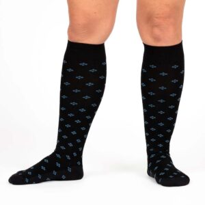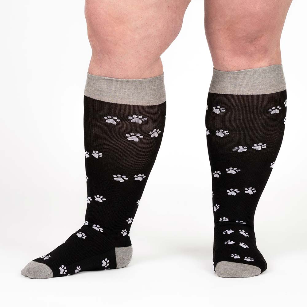 Der Stützstrumpf für alle Tierfreunde: Unser beliebtes Modell Bello gibt es für die ganze Familie. Als Bello Plus für starke Waden verfügt der schwarze Kompressionsstrumpf mit Pfotenmuster über einen breiten Schnitt an Knöchel und Waden. Kombiniert mit dem breiten Komfortbund verhindert er Einschnüren, stützt das Bein aber mit leichter Kompression. Die verarbeitete mercerisierte Baumwolle (Mercerized Cotton) ist besonders weich und fusselfrei.