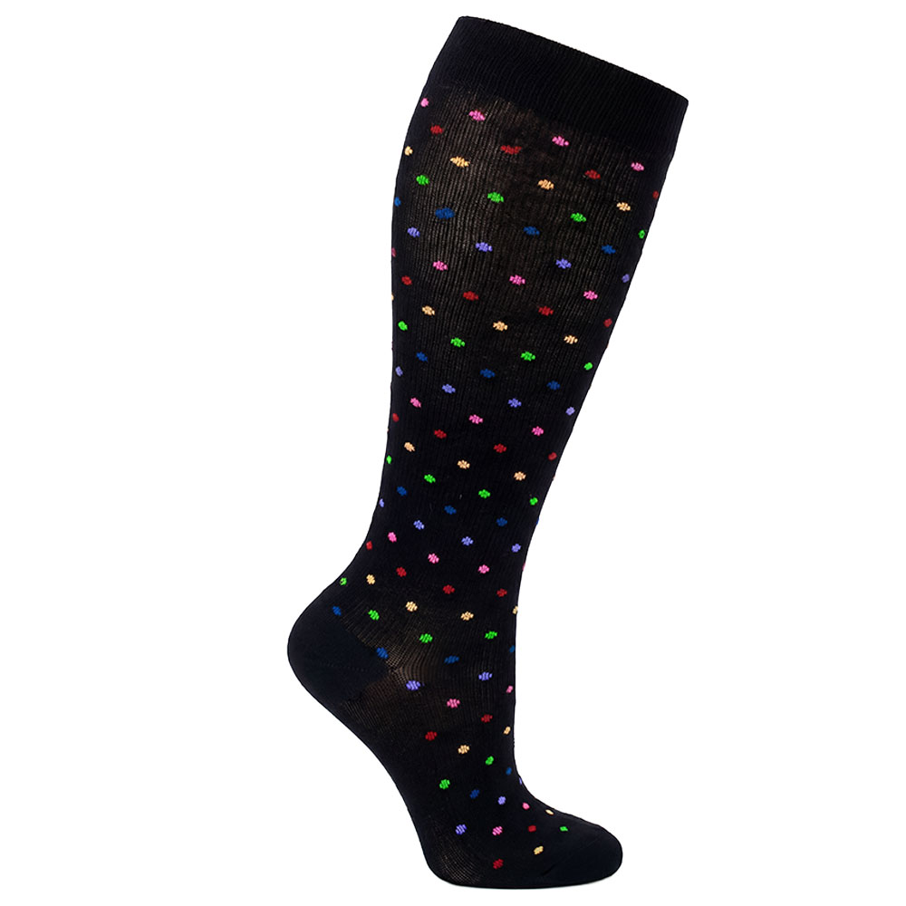 Lass es Konfetti regnen! Die schwarzen Stützstrümpfe für breite Waden Carmen Plus machen mit vielen kleinen Punkten in den xunt-Farben auf sich aufmerksam. Die schwarzen Kompressionsstrümpfe der Klasse 1 werden mit fusselfreier mercerisierter Baumwolle (Mercerized Cotton) hergestellt. Der extra breite Wadenumfang von bis zu 46 cm sowie der breite Komfortbund machen die Strümpfe zu einer wohltuenden Stütze für kräftige Beine.