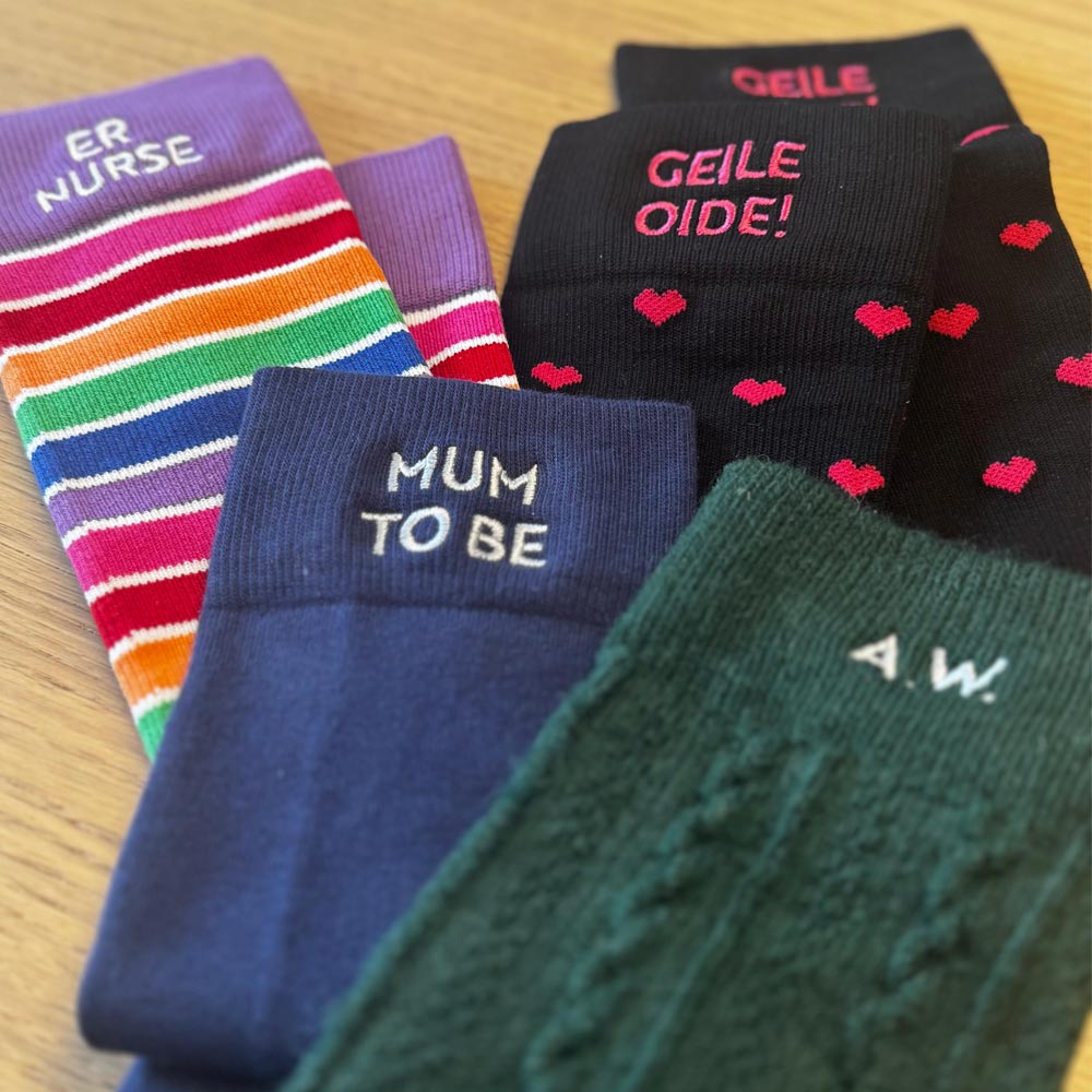 Ein- oder zweizeilig, bis zu 6 Zeichen pro Zeile - ob Initialen, Name, Lieblingswort oder ein kleiner Insider: Du entscheidest, ob beide Struempfe das Gleiche tragen oder jeder Strumpf seine eigene Botschaft bekommt.