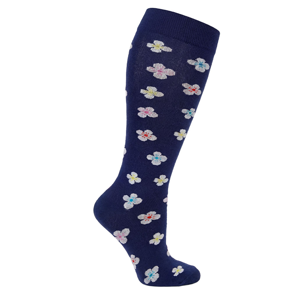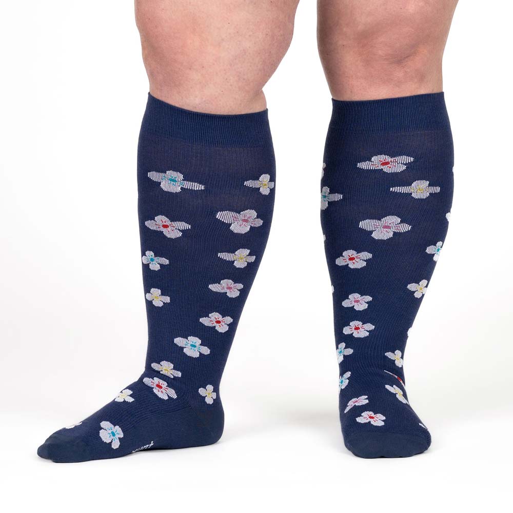 Die Stützstrümpfe Florentina+ sind unser blumiges Modell für starke Waden. Die dunkelblauen Strümpfe mit bunten Blumen sind extraweit geschnitten, damit sie auch breiten Unterschenkeln Tragekomfort bieten, ohne einzuschnüren. Mit hohem Baumwollanteil für ein angenehmes Gefühl auf der Haut.