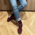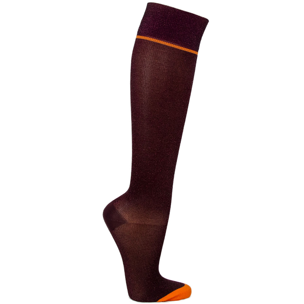 Sattes Bordeaux trifft auf leuchtende orange Akzente an Zehen und Bund: kraftvoll und voller Ausstrahlung.