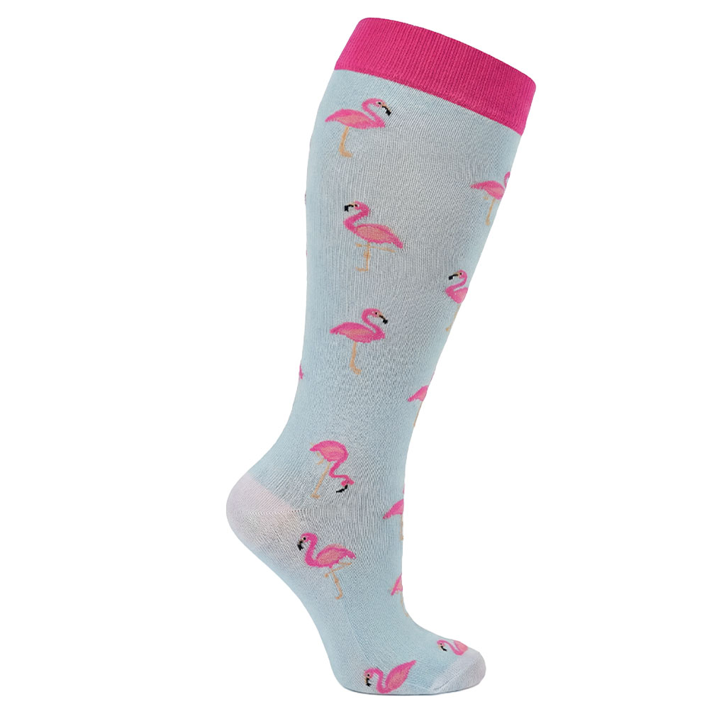 Unsere Flamingo-Strümpfe mit dem Plus an Komfort: Die Stützstrümpfe Gerti+ sind für starke Waden gemacht. Der Umfang an Schenkel und Knöchel ist breiter geschnitten, die hellblauen Strümpfe mit Flamingo-Muster sitzen deshalb auch bei starken Waden richtig bequem. Stützen den ganzen Tag dank leichter Kompression! Auch für schmale Waden erhältlich – weiter zu Gerti.